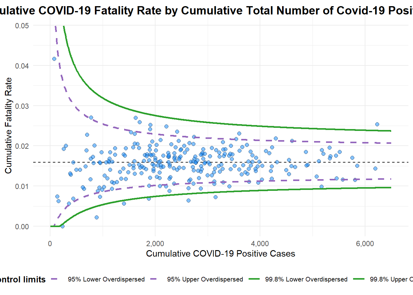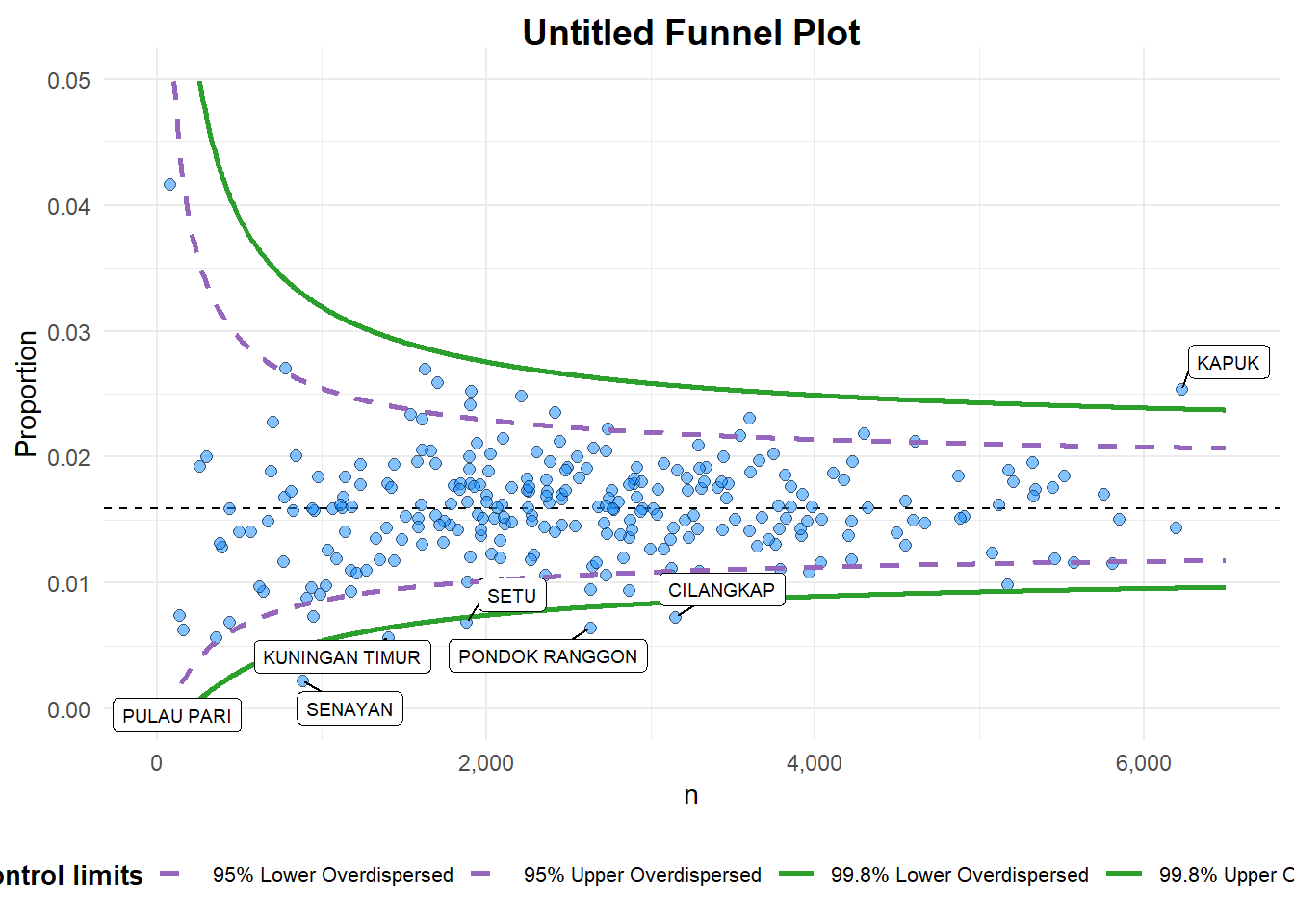 limit: plot limits (95 or 99).label_outliers: to label outliers (true or false).Poisson_limits: to add Poisson limits to the plot.OD_adjust: to add overdispersed limits to the plot.xrangeandyrange: to specify the range to display for axes, acts like a zoom function.- Other aesthetic components such as graph title, axis labels etc.